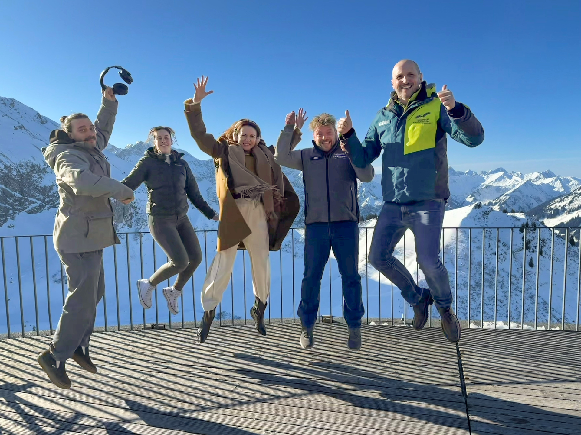 (v.l.n.r.): Josef Gruber (Heim und Gruber, Projektleitung), Laura Kleiner (Projektleitung), Justina Rokita (Vorstand Kleinwalsertal Tourismus), Peter Moser (Gastronomieleitung Adlerhorst) und Andreas Gapp (Vorstand OK Bergbahnen).
